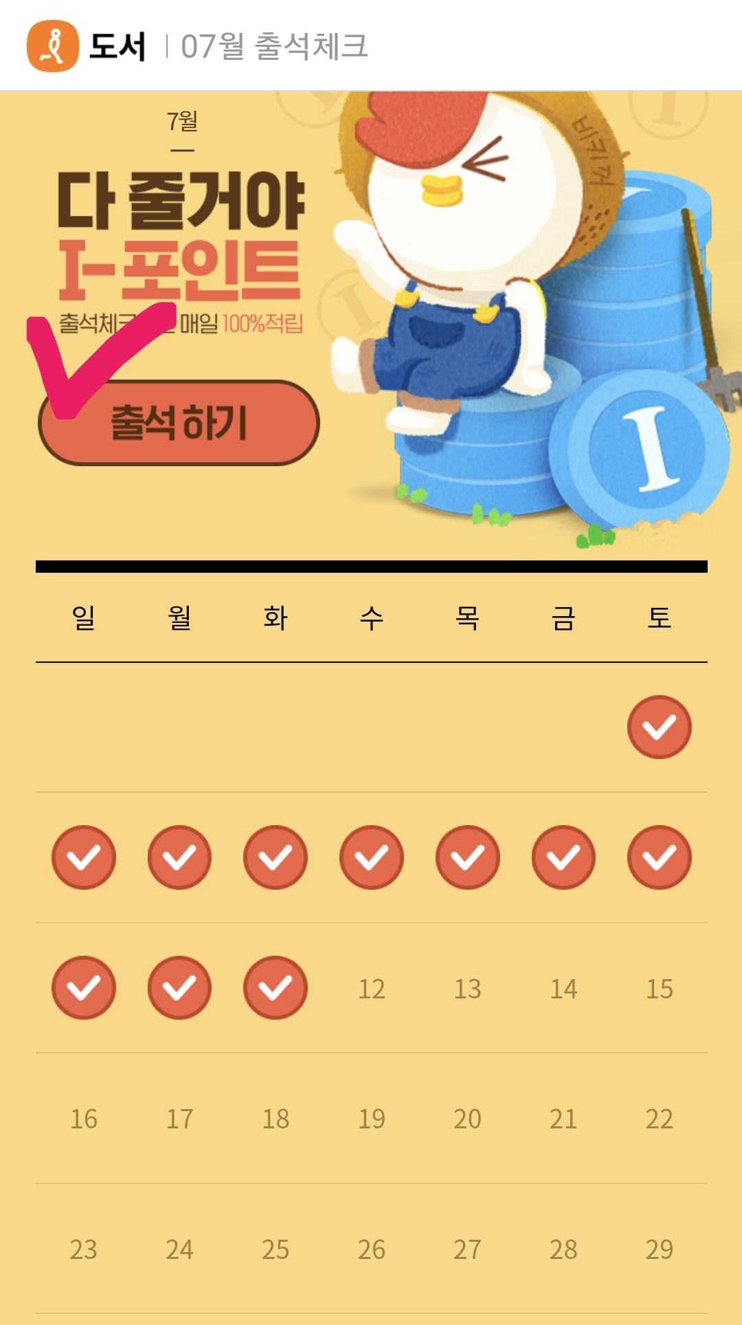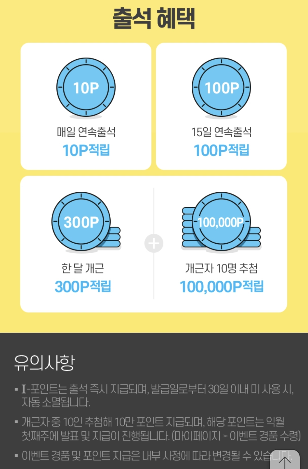 출석체크하기 버튼 누르면 매일 10p 씩 적립되고 개근자 10명 추첨으로 10만 아이포인트 준대요