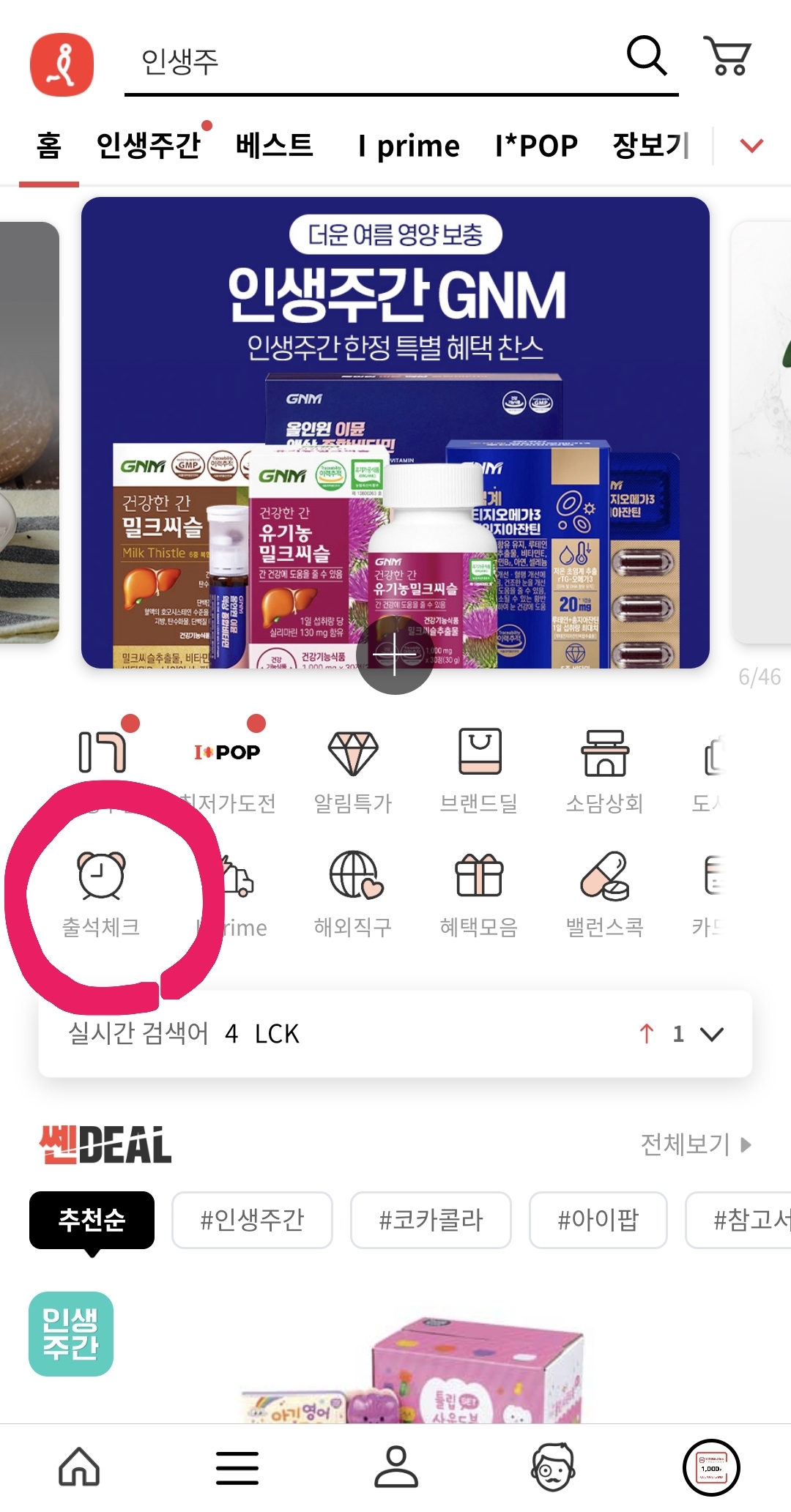 인터파크 쇼핑앱 첫 화면에서 중간에 '출석체크' 있어요