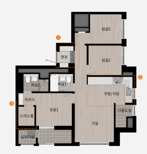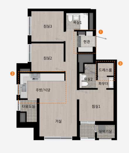 ◐ 74C(방3/화2/드레스룸/파우더룸)