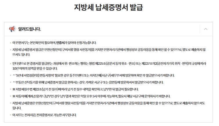 지방세 납세증명서 발급 관련 안내사항 읽어주세요