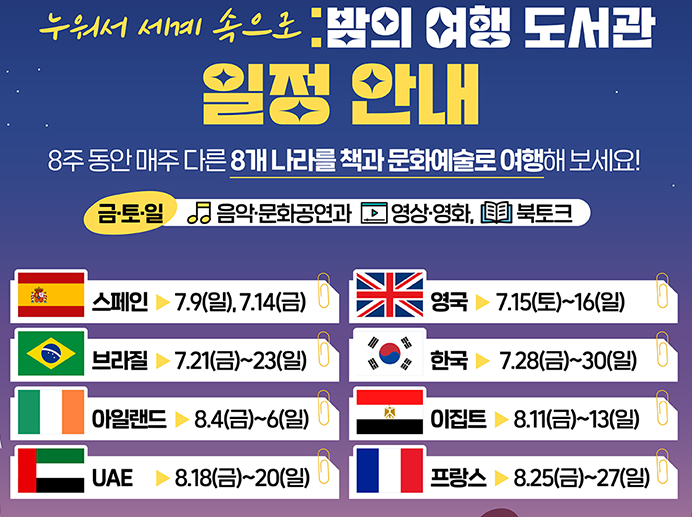 여름철 일상을 벗어나고픈 시민들의 마음을 담아 풀밭 위의 여행 테마로 책과 함께 여행을 떠나게 될 8개 국가를 선정하였으며 책과 함께 여행을 떠나보세요