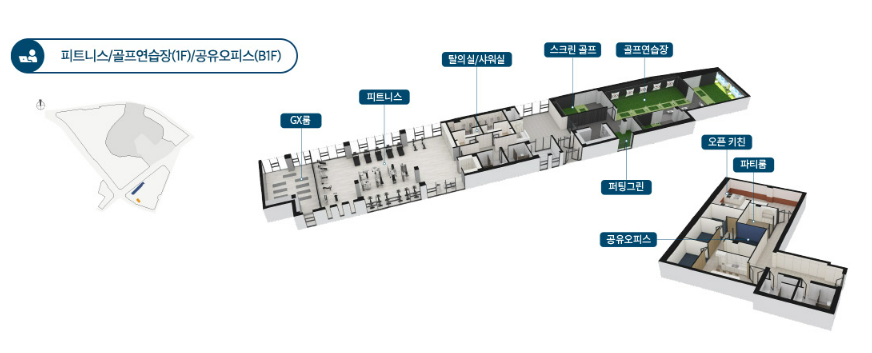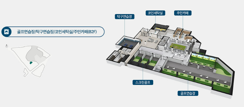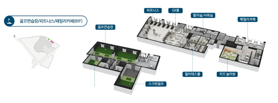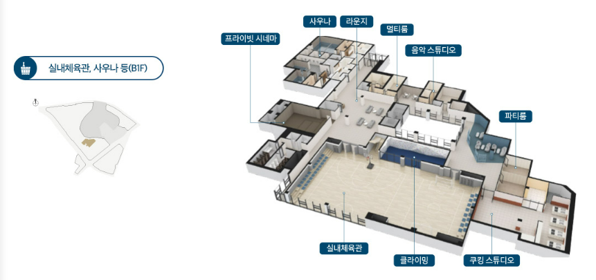 GX룸, 피트니스, 스피닝, 사우나, 프라이빗 시네마, 멀티룸, 음악스튜디오, 파티룸, 쿠킹스튜디오, 실내체육관, 클라이밍, 작은도서관, 스터디룸, 골프연습장 등 커뮤니티가 엄청 다양합니다