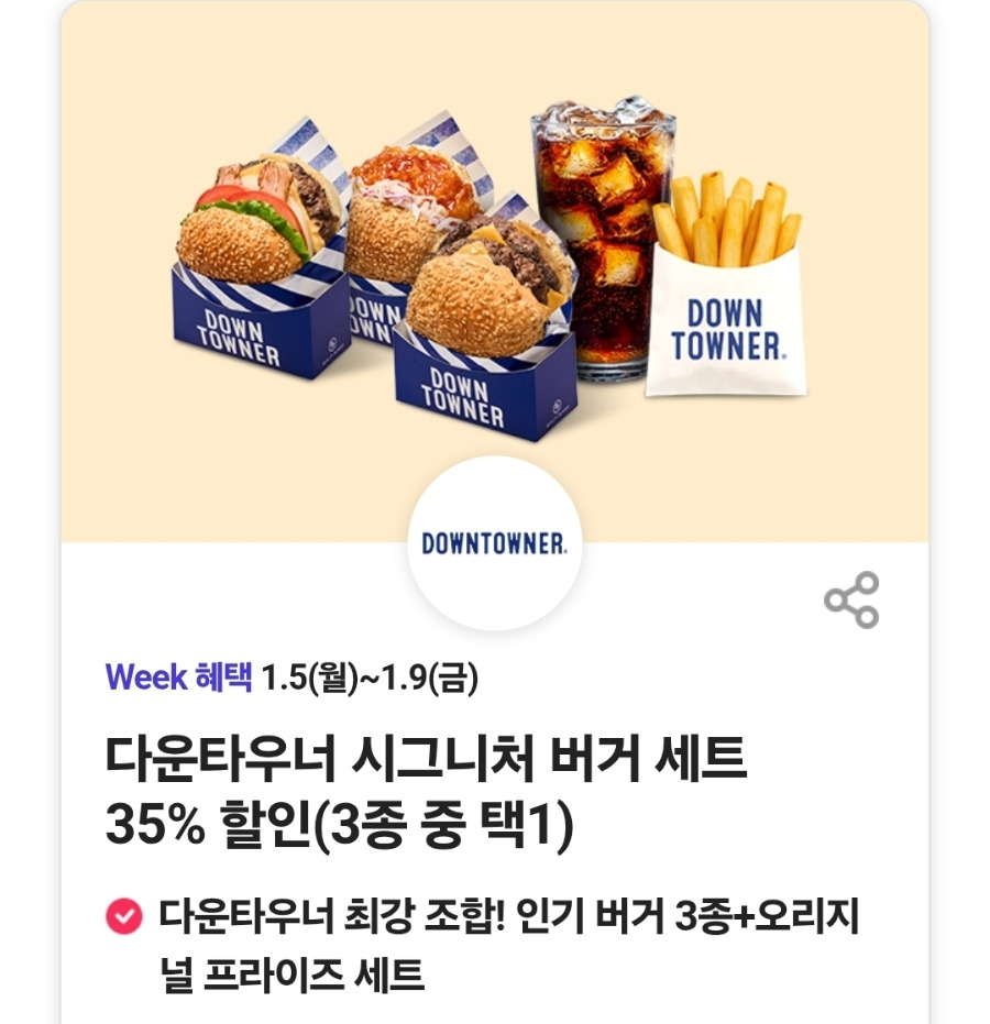다운타우너 시그니처 버거 세트 35% 할인 (3종 중 택1)