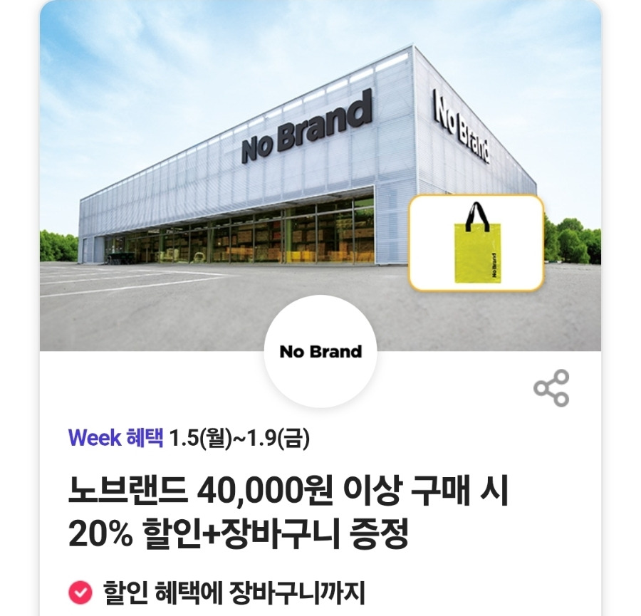노브랜드 40,000원 이상 구매 시 20% 할인 + 장바구니 증정(선착순 5만 개)