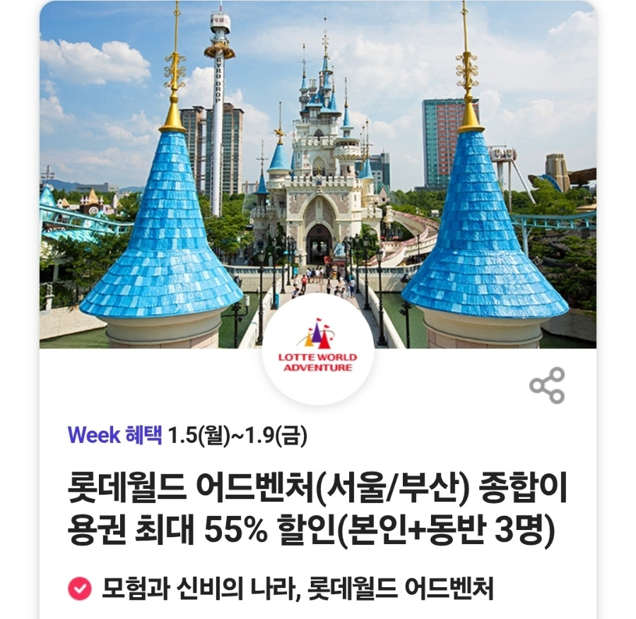 롯데월드 어드벤처 서울 : 본인 50%+동반 3인 30%할인, 츄러스 1개 무료