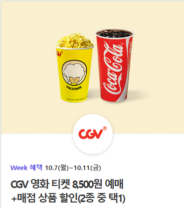CGV 영화 티켓 8,500원 예매 + 매점 상품 할인 2종 중 택 1