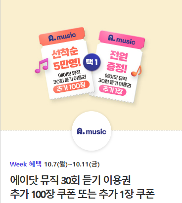 에이닷 뮤직 30회 듣기 이용권 추가 100장 또는 추가 1장 쿠폰 증정