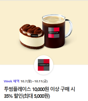 투썸플레이스 10,000원 이상 구매 시 35% 할인 받을 수 있으며 최대 5,000원 한도입니다