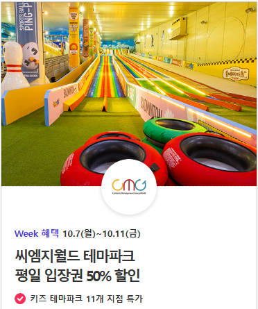 씨엠지월드 테마파크 평일 입장권 50% 할인 됩니다
