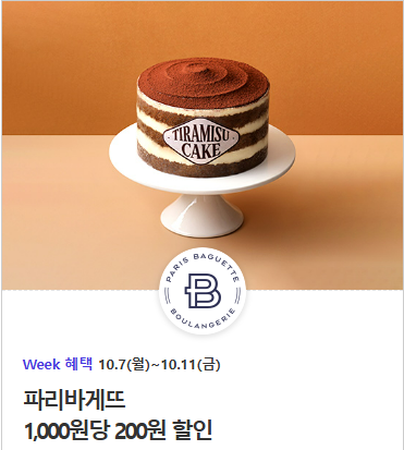 파리바게뜨 1,000원 당 200원 할인되며 정가 기준 구매 금액 30,000원 한도내로 최대 6,000원 할인 됩니다
