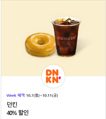 던킨 40% 할인 받으실 수 있으며 정가 기준 주문 금액 15,000원 한도로 최대 6,000원 할인 가능합니다