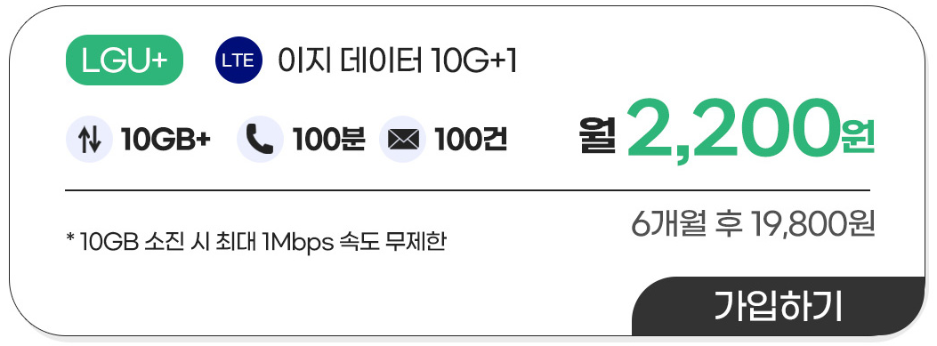 10GB 다 쓰셔도 1 Mbps 속도로 무제한 데이터 사용 가능합니다