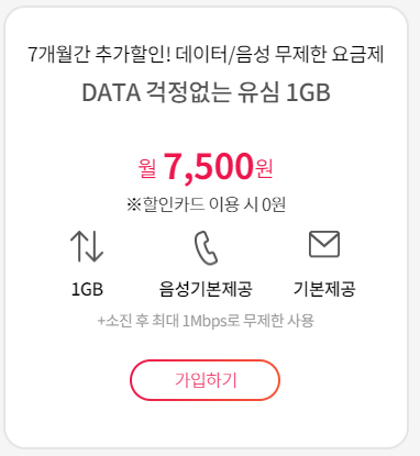 데이터 1GB 제공 후 소진 시 1 Mbps로 무제한 사용 가능한 요금제도 카드 실적 할인받으시면 0원에 이용 가능합니다