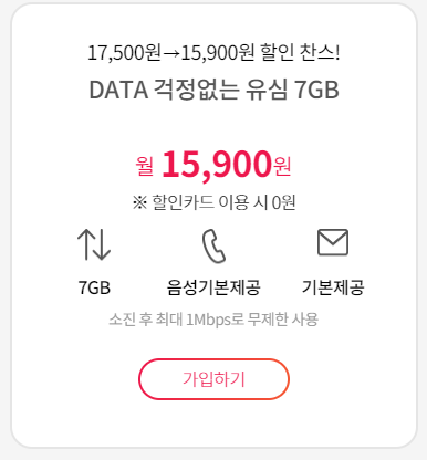 데이터 1GB 제공 후 소진 시 1 Mbps로 무제한 사용 가능한 요금제도 카드 실적 할인받으시면 0원에 이용 가능합니다
