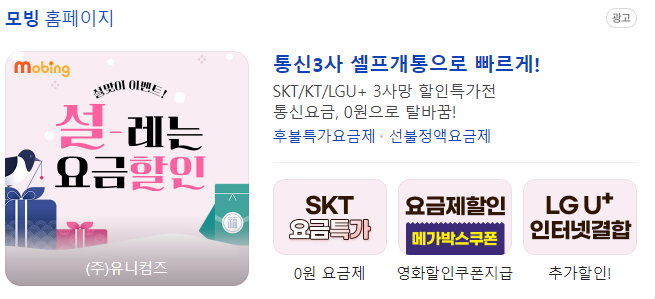 요금제 사진 누르시면 모빙 홈페이지로 바로 이동합니다