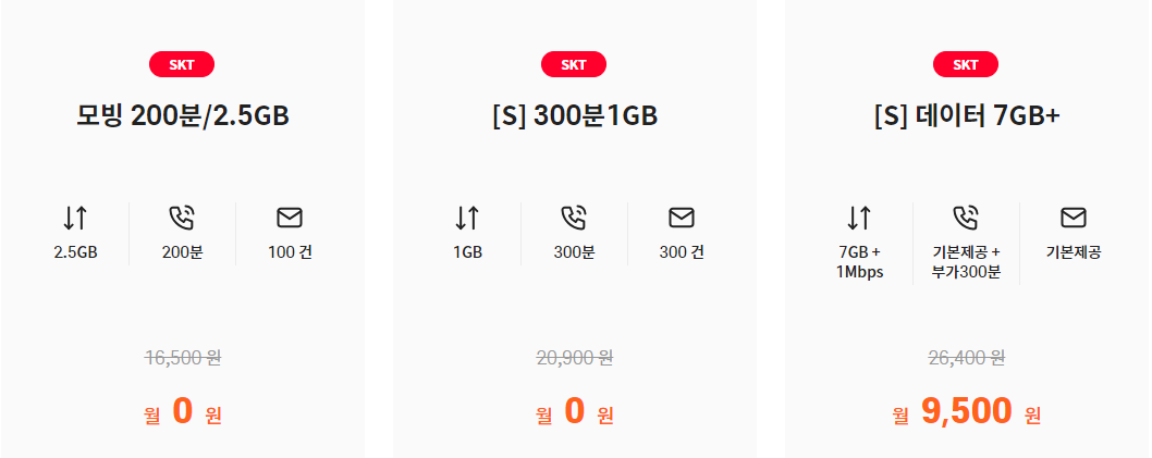 데이터가 많이 필요 없으시다면 SKT는 0원 요금제도 있습니다