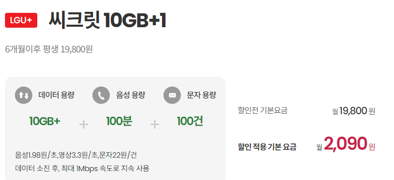 데이터 많이 필요하신 분은 2,090원에 10GB, 전화 100분, 문자 100건 사용하실 수 있습니다