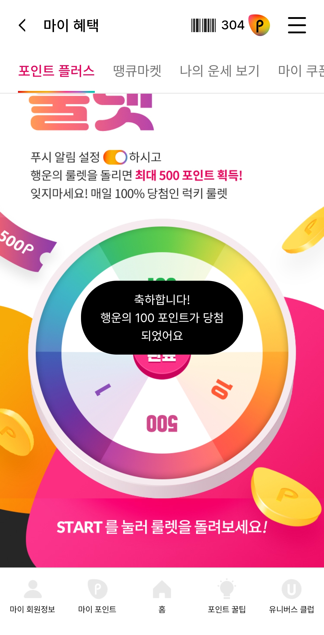 룰렛은 가끔 1000 포인트도 당첨돼요 12월 마지막은 100 점 당첨!