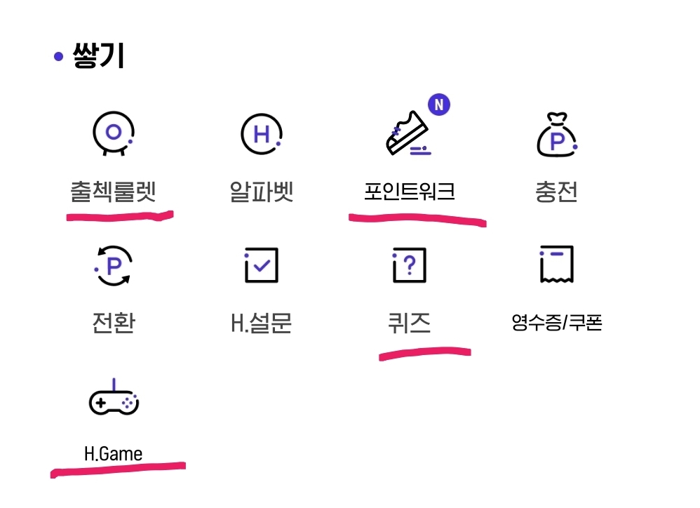 HPOINT 앱에서 출석 룰렛, 포인트워크(만보기), 퀴즈, H.GAME 으로 포인트 모으고 있어요