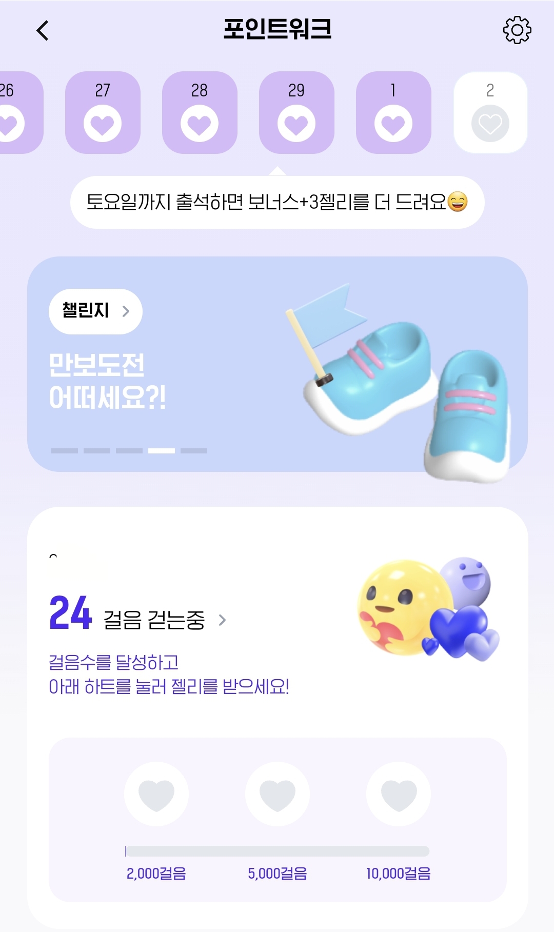 출석 룰렛에서 얻은 알파벳으로 포인트 교환하고, 포인트 워크에서 받은 젤리로 포인트 교환해요