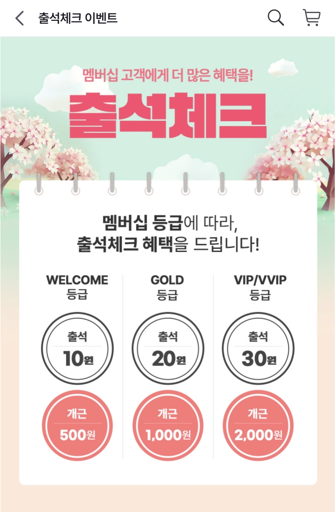 등급에 따라 출석체크 포인트 금액이 다르고 만근 적립금도 달라요