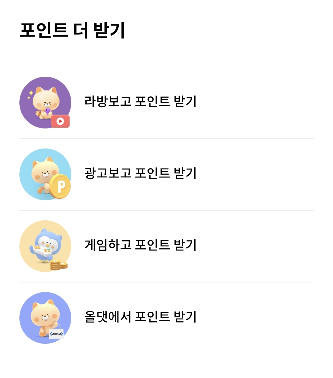 퀴즈왕 OX퀴즈, 올댓 출석체크, 마이카 출석체크로 포인트 모으고 있고, 광고나 게임하고도 포인트 받을 수 있어요