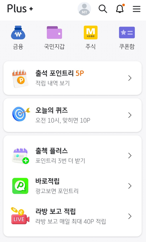 KB PAY 앱에서 출석체크, 오늘의 퀴즈(오전 10시 이후), 출첵 플러스에서 광고 보면서 포인트 모을 수 있어요