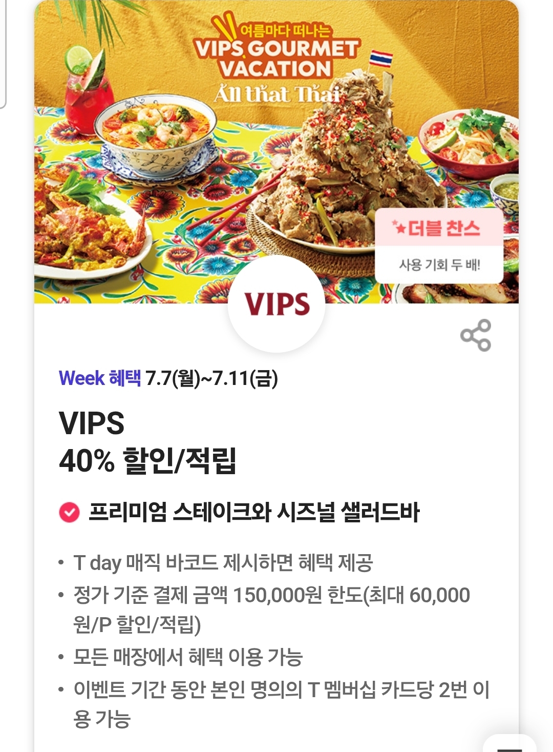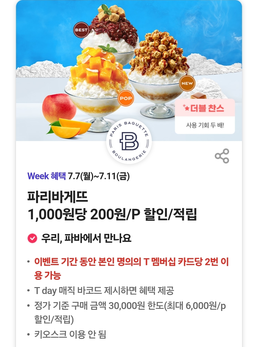 7/7부터 7/11 까지 그리팅, 처갓집양념치킨, 투썸플레이스, 파리바게뜨, 이케아, 노브랜드버거, 빕스, 캐리비안베이, 구글플레이 기프트코드, 백미당, 롯데시네마, 시사회이벤트 , 홀리닭 등 다양한 티데이 쿠폰과 혜택 잘 챙기세요
