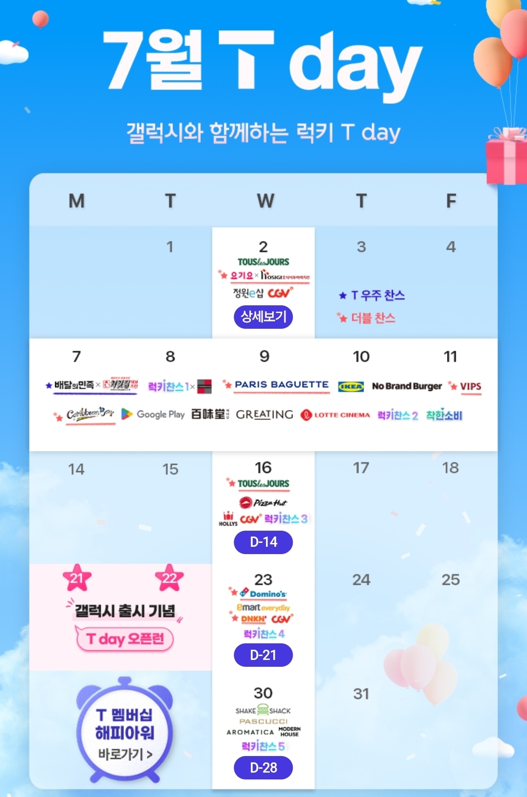 7월 16일, 23일, 30일에는 뚜레쥬르 피자헛, 할리스커피, CGV, 도미노피자, 이마트에브리데이, 던킨, 쉑쉑, 파스쿠치, 아로마티카 예정되어 있습니다