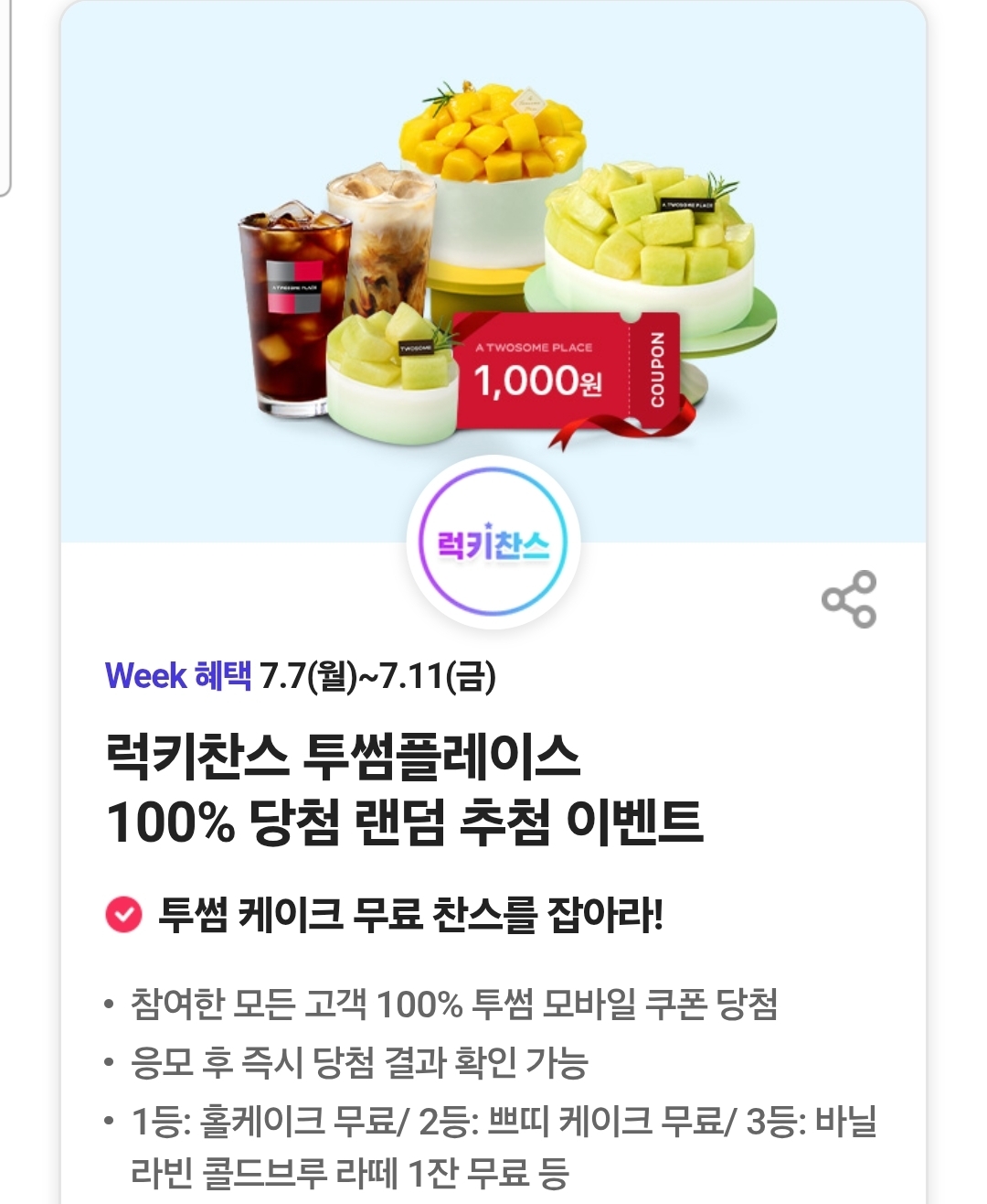 럭키찬스X투썸플레이스 100% 쿠폰 당첨