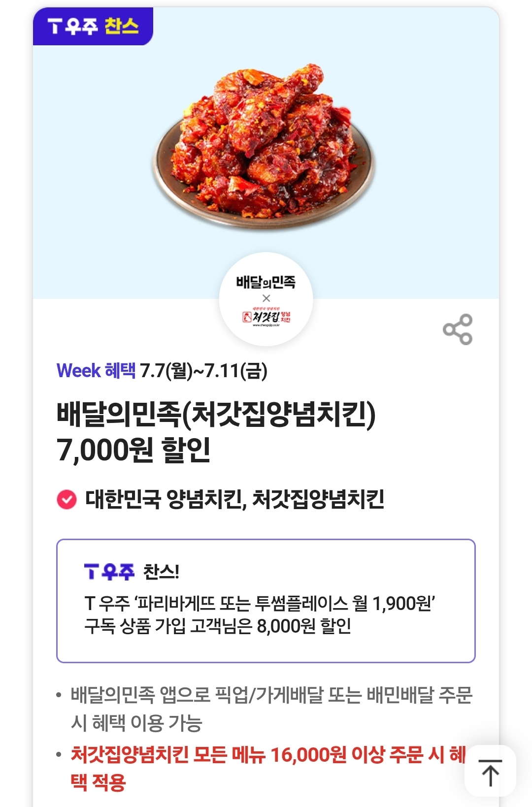 배달의민족 앱으로 픽업/가게배달 또는 배민배달 주문시 7,000원 할인