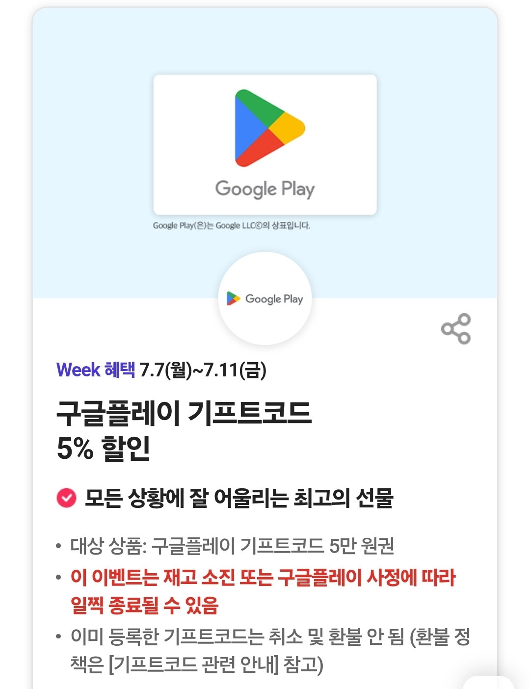 대상상품 : 구글플레이 기프트코드 5만원권