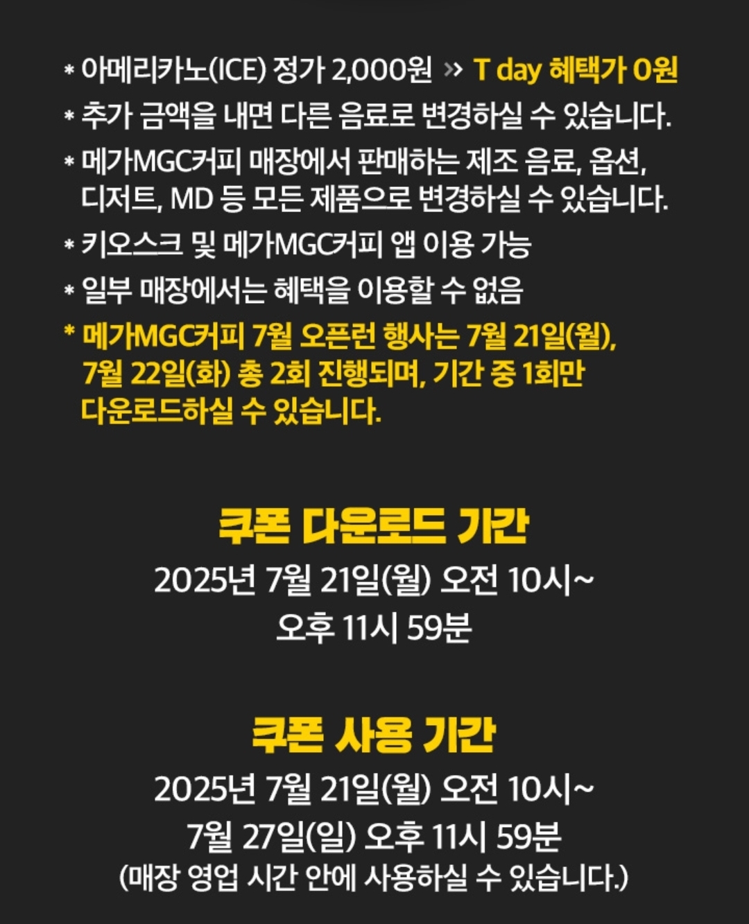 7월 21 오전 10시부터 선착순 370,000명에게 메가커피 아메리카노 1장 무료 증정 이벤트도 진행됩니다