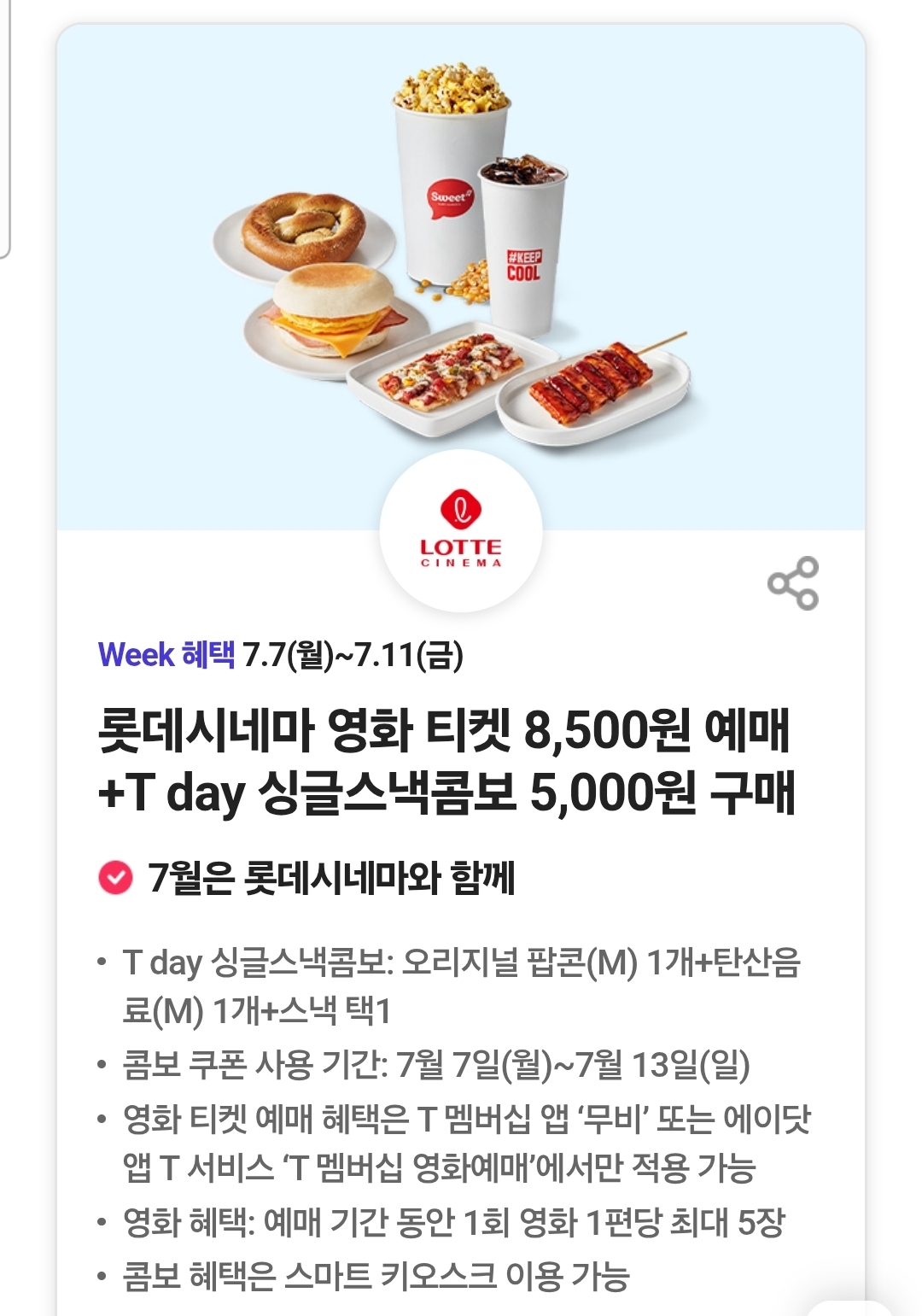 롯데시네마 영화 티켓 8,500원 예매 + T DAY 싱글스낵콤보 5,000원 구매