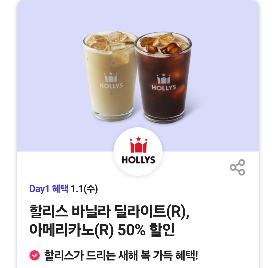 할리스 바닐라 딜라이트(R), 아메리카노(R) 50% 할인
