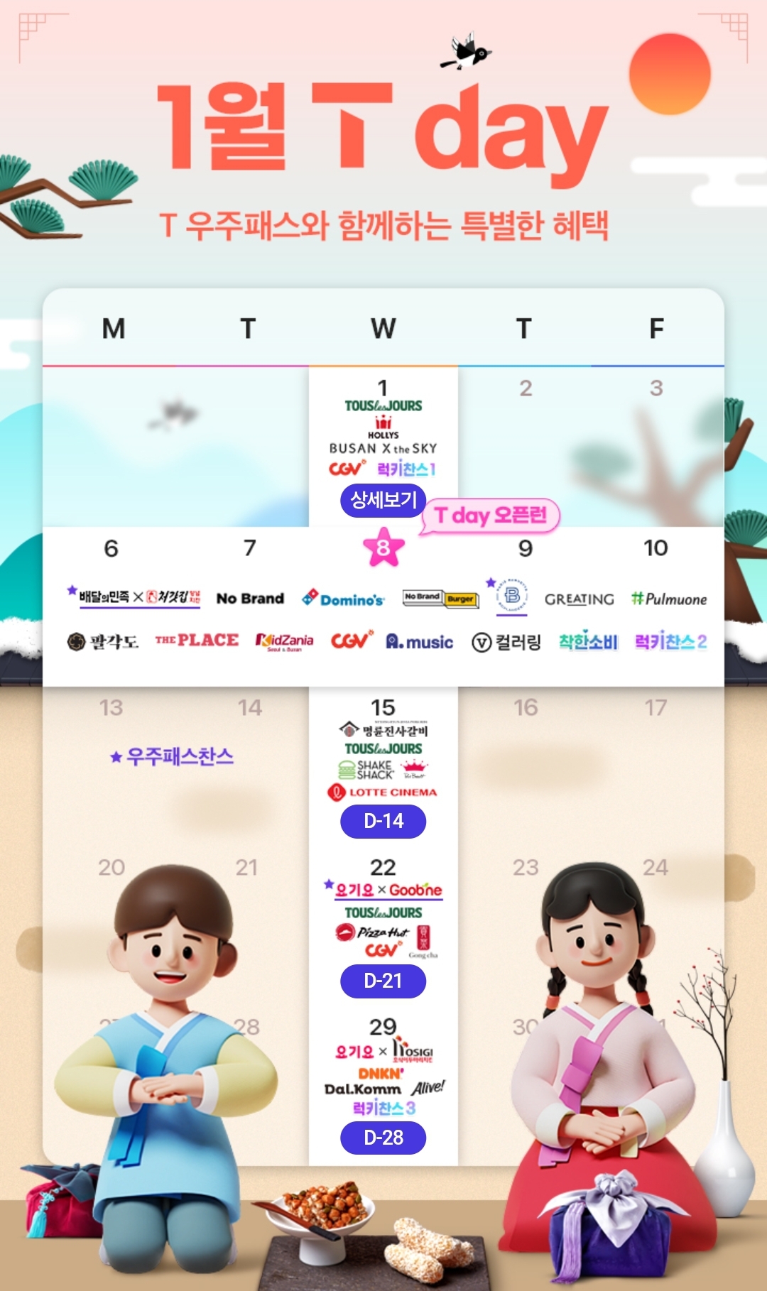 티데이란 달력에서 T 모양인 날짜에 지정된 브랜드의 할인쿠폰을 제공하는 SKT이용자만 혜택 받을 수 있는 이벤트 입니다