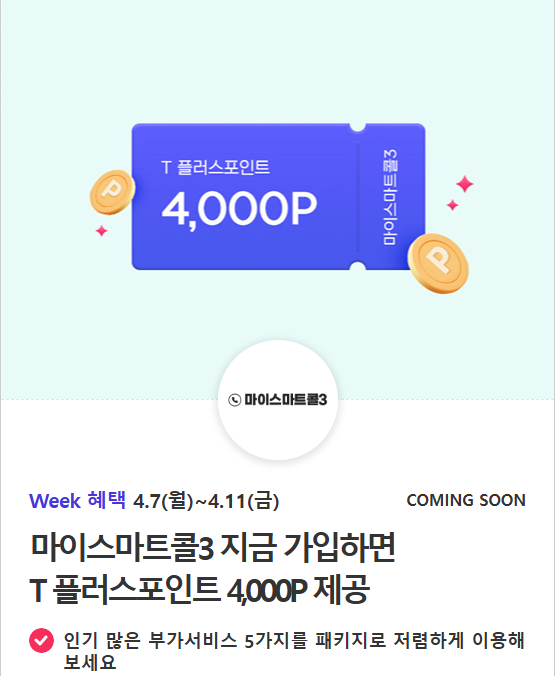 마이스마트콜3 지금 가입하면 T플러스포인트 4,000P 제공