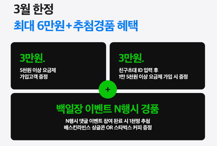 3월 한정 이벤트로 5천원 이상 요금제 가입고객에게 3만원, 친구 초대로 가입시 추가로 3만원 혜택이 있습니다