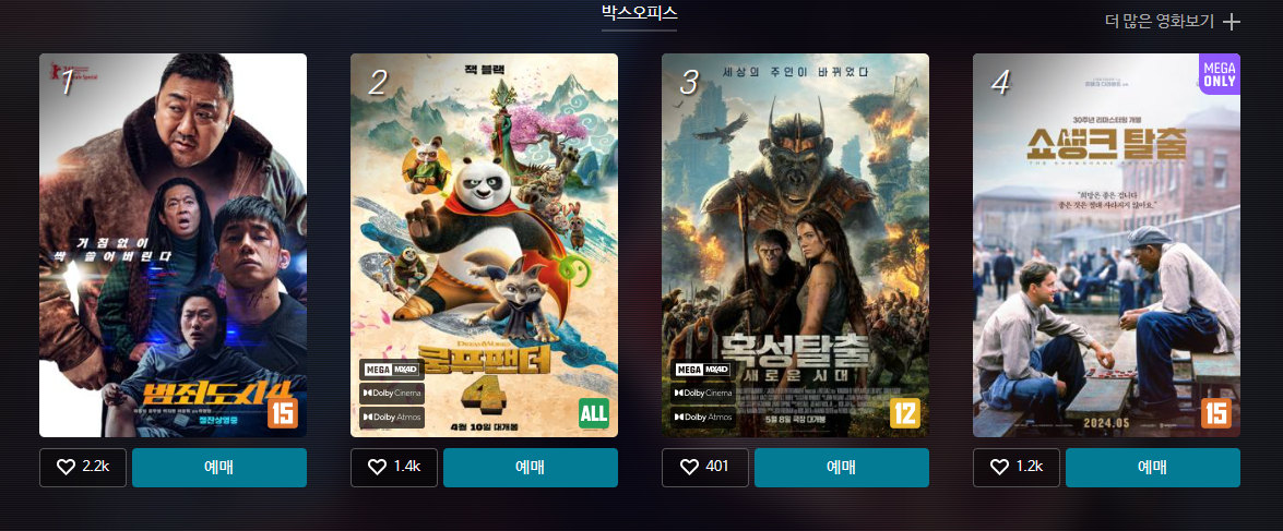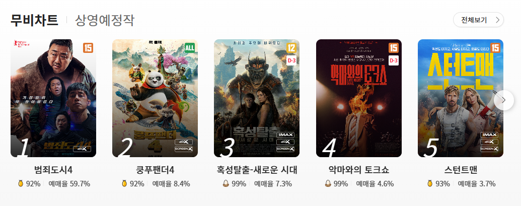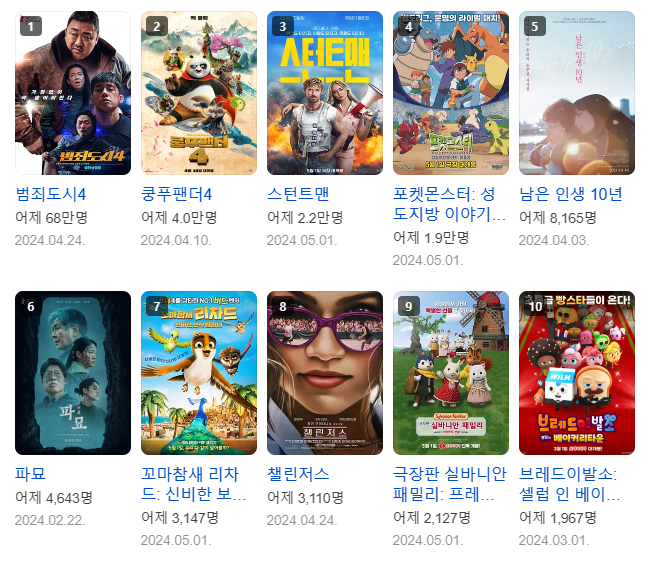 역시 범죄도시4가 1위이고 2위는 쿵푸팬더4 입니다