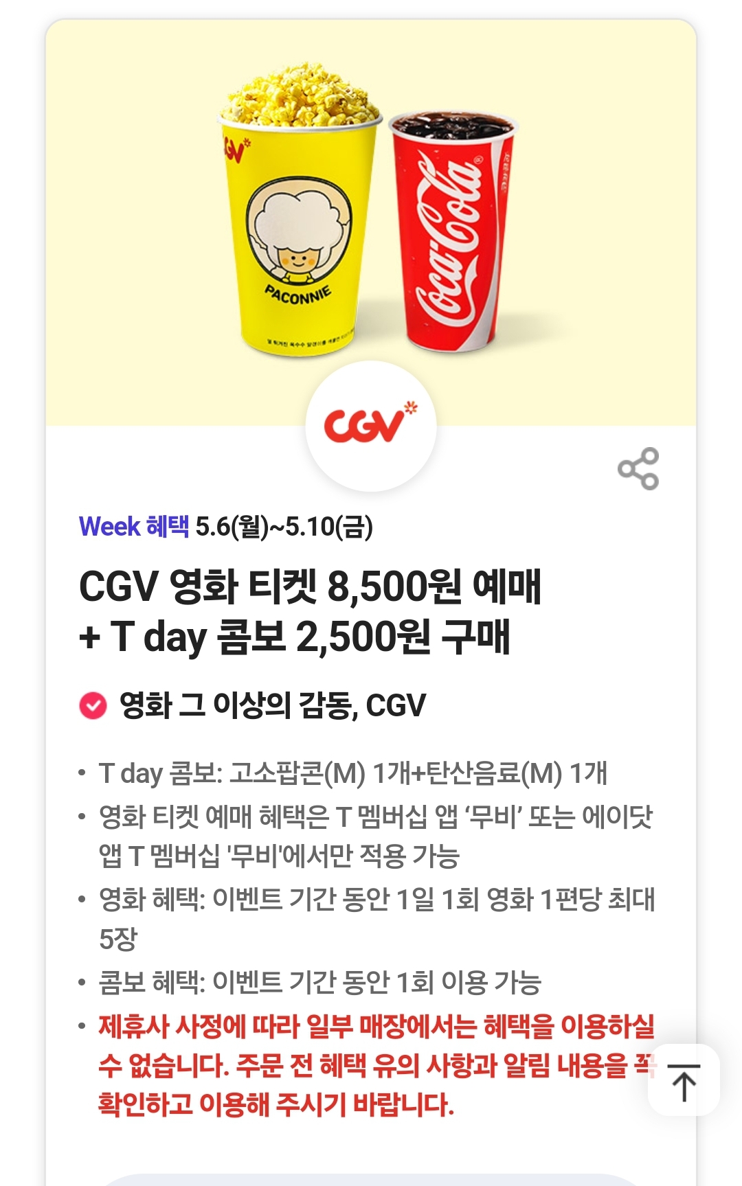 CGV 영화티켓 8,500원 예매 + T DAY 콤보 2,500원 구매