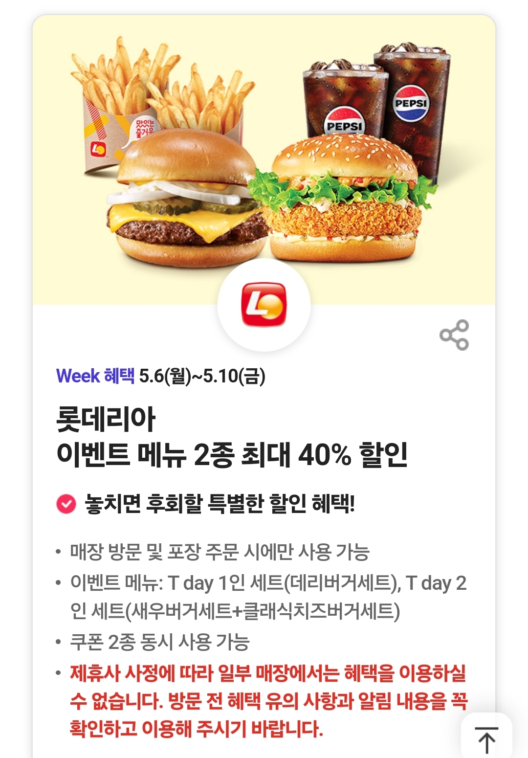 TDAY 1인 세트(데리버거세트) , TDAY2인 세트(새우버거세트+클래식치즈버거세트) 최대 40%할인