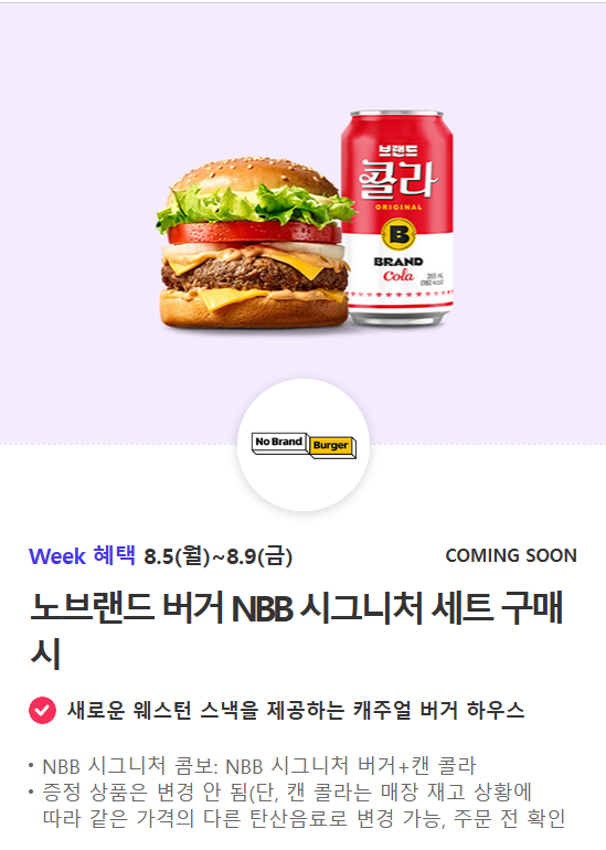 NBB 시그니처 콤보 : NBB 시그니처 버거 (정가 4,800원) + 캔콜라 (정가 1,900원)