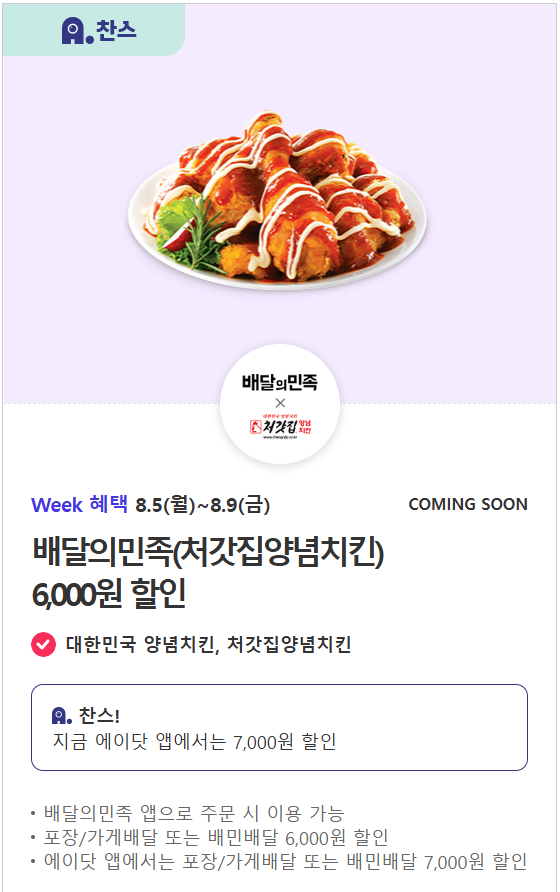 배달의민족 처갓집 양념치킨 6,000원 할인