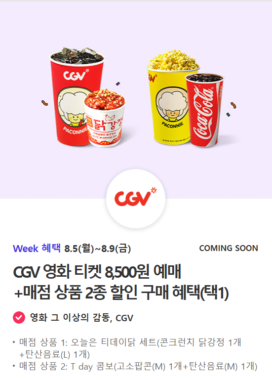 매점 상품 2 : CGV T DAY 콤보(고소팝콘(M) 1개 + 탄산음료(M) 1개 ) 2,500원 구매