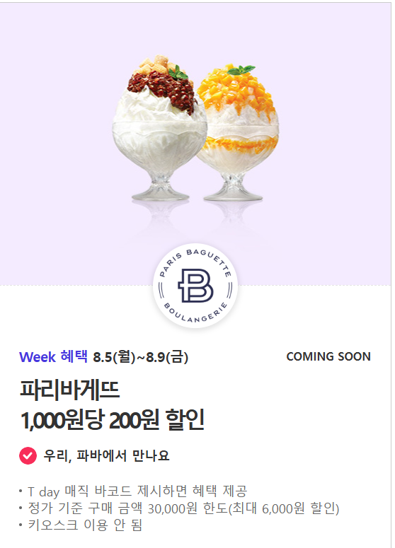 추후 8월 티데이 이벤트에 나올 브랜드는 뚜레쥬르, 공차, 메가박스, 이디야커피, 던킨, 피자헛, 역전우동, 롯데시네마, 메가커피, 쉑쉑버거, 두찜 등 다양한 브랜드가 대기 중입니다
