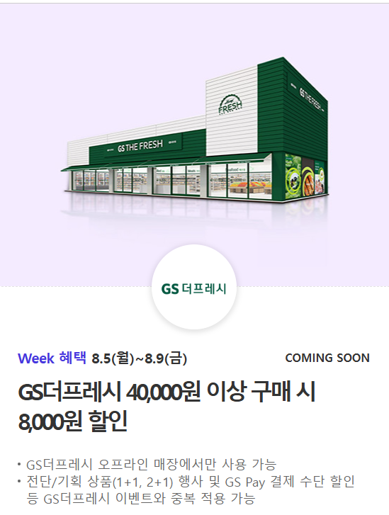 GS더프레시 오프라인 매장에서 40,000원 이상 구매시 8,000원 할인