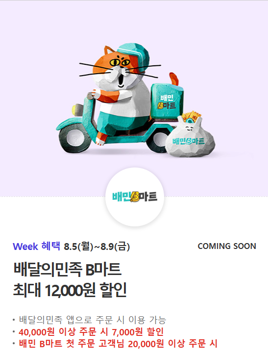 배민 B마트 첫 주문 고객은 20,000원 이상 주문 시 12,000원 할인 쿠폰 1장