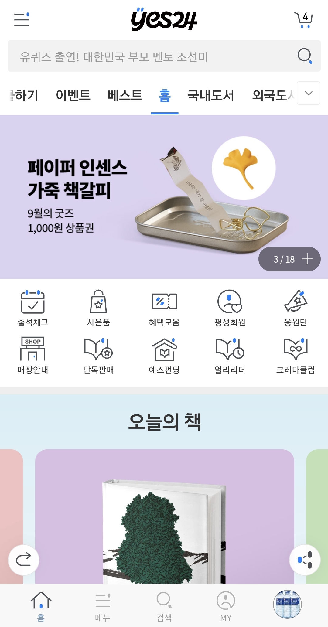 YES24 도서앱 설치하시고 메인화면 중간 왼쪽에 출석체크 눌러주세요