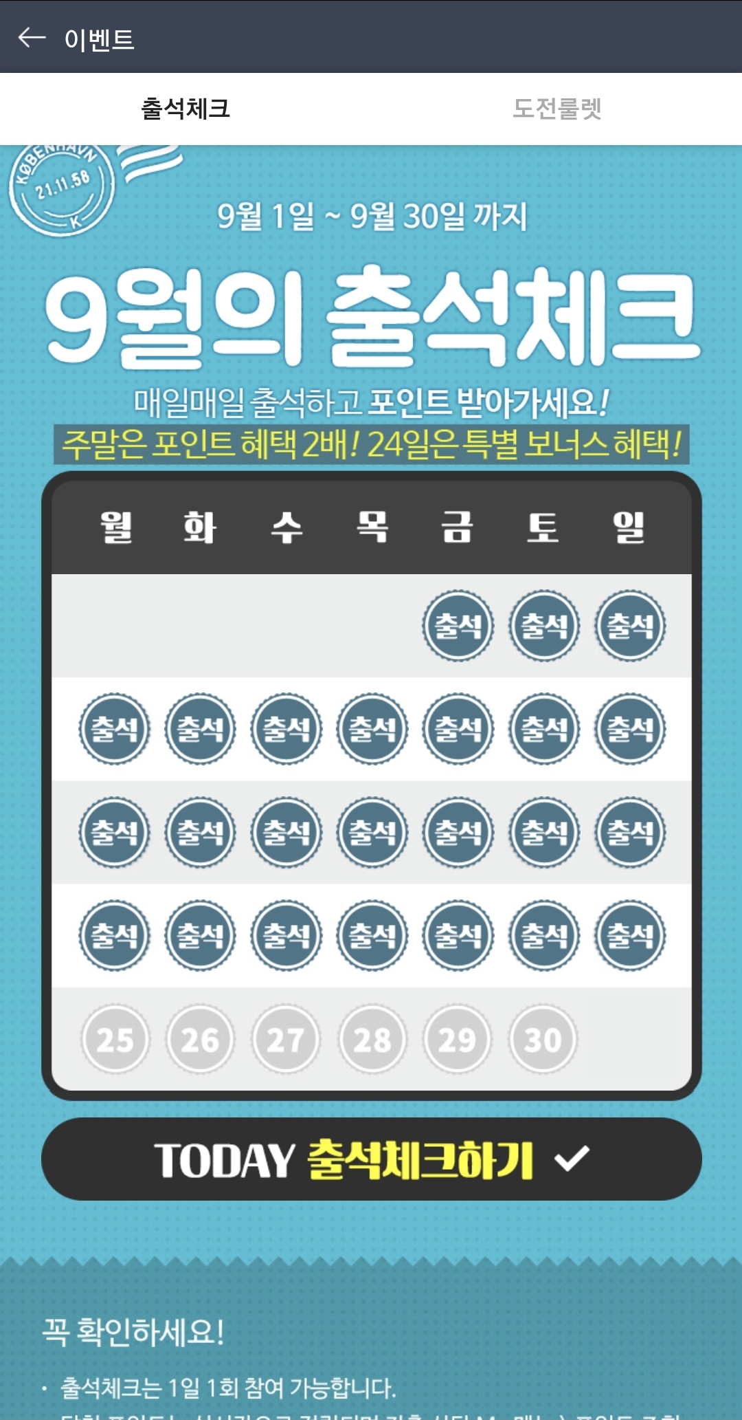 출석체크는 매일 1포인트, 주말엔 2포인트 적립되고 24일엔 24포인트 적립됩니다