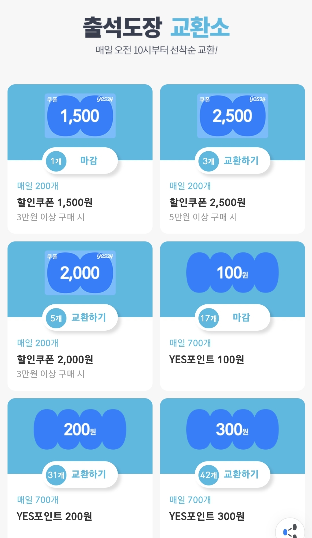 이렇게 모은 도장은 출석도장 교환소에서 매일 오전 10시부터 선착순으로 교환 가능합니다